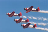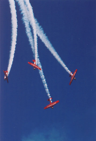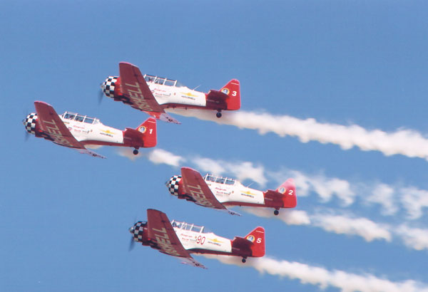 | The Aeroshell Aerobatic team flies a formation demonstration in World War 2 era T-6 trainers. It's a great team to photograph, and they put on a great show. | |||
